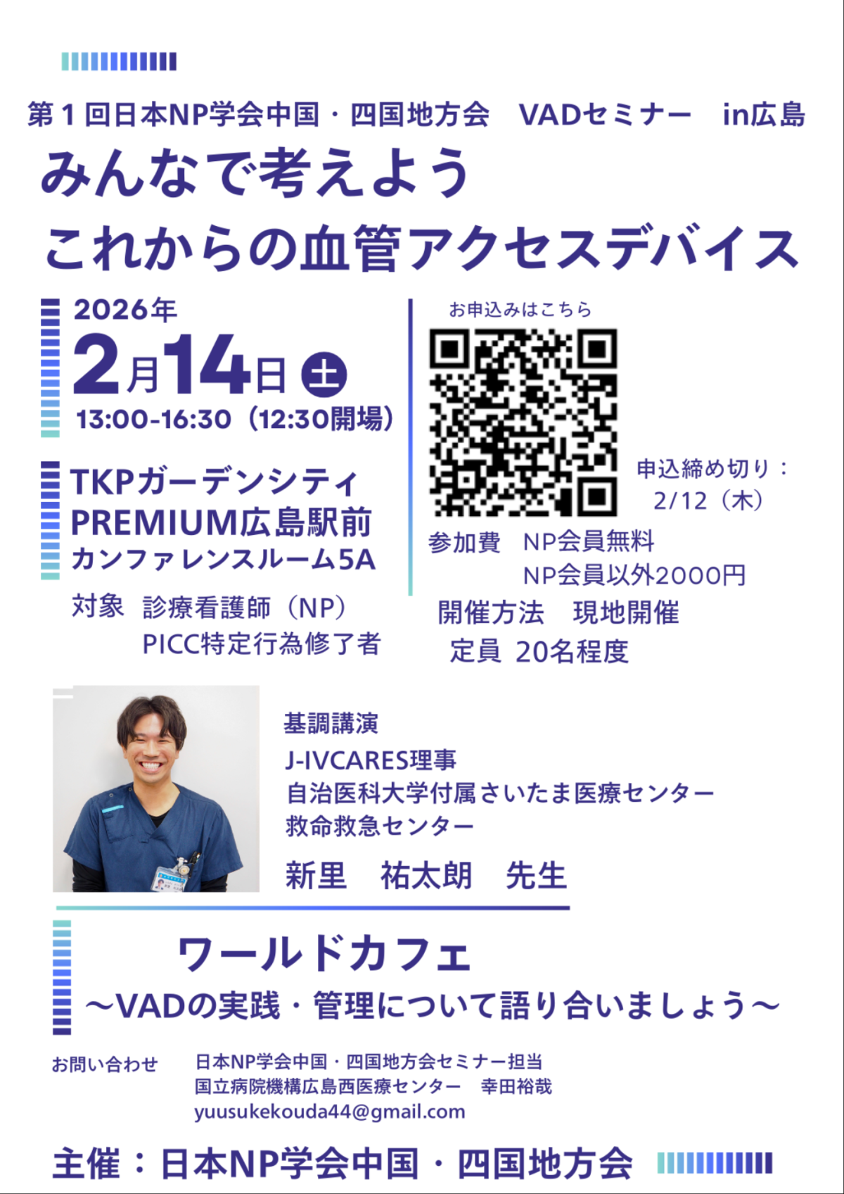 13:00-13:05 開会挨拶13:05-13:50 基調講演 J-IVCARES理事 自治医科大学付属さいたま医療センター救命救急センター 新里祐太朗先生13:50-14:30 企業プレゼン、展示14:30-14:45 休憩(15分)14:45-15:55 ワールドカフェ グループワーク15:55-16:25 発表16:25-16:30 閉会挨拶